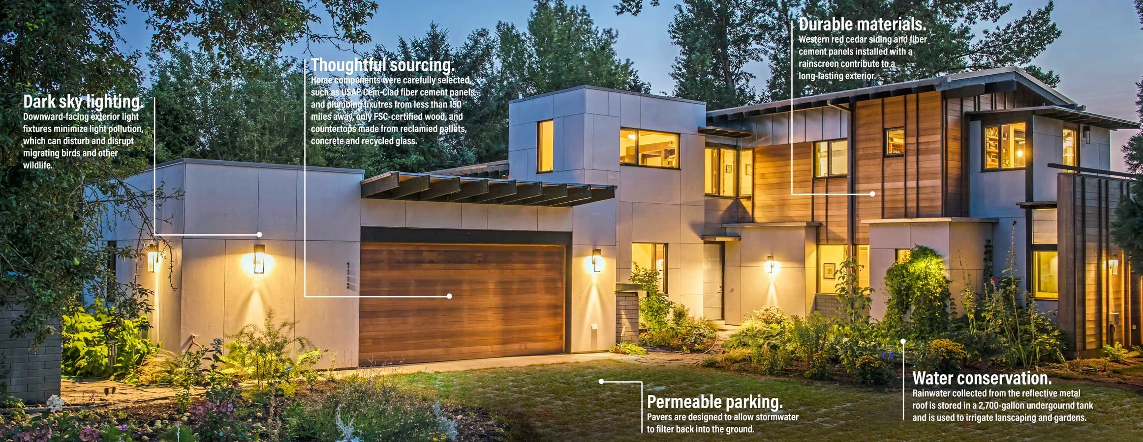 Energy: Ground-source heat pump, All electric house for no fossil fuel use, 5.25 kW solar array, Breathable envelope (R53 ceiling, R30 walls, R59 floor), Soy based closed cell spray foam insulation, ICF basement construction, Reflective metal roof, High CRI, high efficiency LED lighting, natural daylighting, Local materials. Water: Potable rainwater system with 2700 gallon storage, Permeable driveway, No outdoor paints used. Materials: Recycled gypsum, fiber cement (with reclaimed fly ash siding). Indoor Air Quality: Formaldehyde-free plywood, Continuous ventilation with HRV fans, Siding is installed with a “rain screen” air space. Site: Xeriscaping